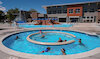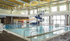 Indoor, Myrtha technology, "L" shaped pool with 6 lane x 25 yard competition area, 1 and 3 meter diving boards, small slide, large shallow area with steps, deck sprays and ADA accessible ramp.
