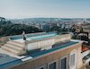 The pool was built on the roof of a building that was transformed into a solarium. The final product is perfectly integrated into the classy surrounding views, thanks to the skilful use of marble. The modern touch is given by minimalist details, like the entrance stairs and the transparent wall, that allows for better admiration of the panorama of Rome while taking a dip.
