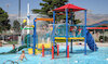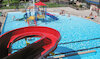 Una piscina con entrada gradual, juegos acuáticos y toboganes, una pequeña piscina hidromasaje y una zona para nadar equipada con ocho carriles de 25 m y seis carriles de 50 m.