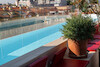 Larga, espectacular, dominando la ciudad: la piscina del Hotel Calimala se concibe como una arquitectura del agua. Su revestimiento con efecto mármol se hace eco del refinamiento de los interiores, mientras que el borde de desbordamiento infinito, revestido de un delicado laminam blanco, aporta un toque inconfundiblemente contemporáneo, creando una transición visual fluida entre la superficie del agua y el horizonte urbano que se extiende más allá.